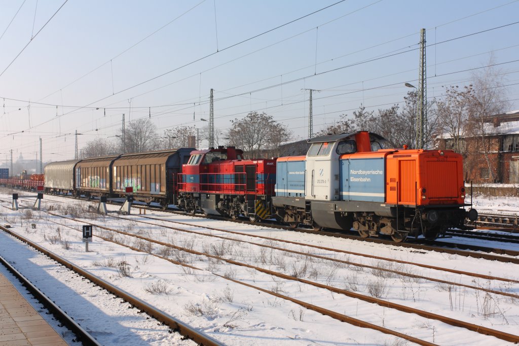 212 270-3 der Nordbayerischen Eisenbahn und eine MaK 1000BB von Vossloh ziehen einen gemischten Güterzug durch Magdeburg Hbf. Fotografiert am 17.02.2010.