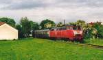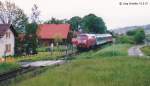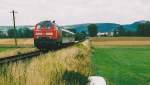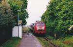 Am südwestlichen Ortsrand von Ipsheim wird die B 470 gekreuzt. Am26.9.97 zog noch eine Lok der Baureihe 212 zwei modernisierte Silberlinge über den blinklichtgesicherten Bahnübergang.