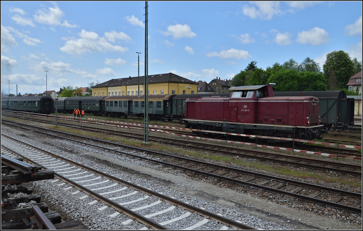 Ein bisschen aus der Zeit gefallen... Bm-Wägen, Silberling, Umbauvierachser und 212 084-4, die noch einen Hilfsgepäckwagen verdeckt. Aulendorf, Mai 2014.