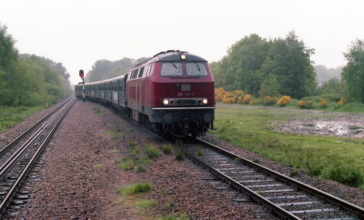 DB 216 150-3 im Einsatz als Mietlok mit Zug 7955 von Zwolle nach Enschede. Ankunft in Heino am 26.05.1983. Scanbild 93089.