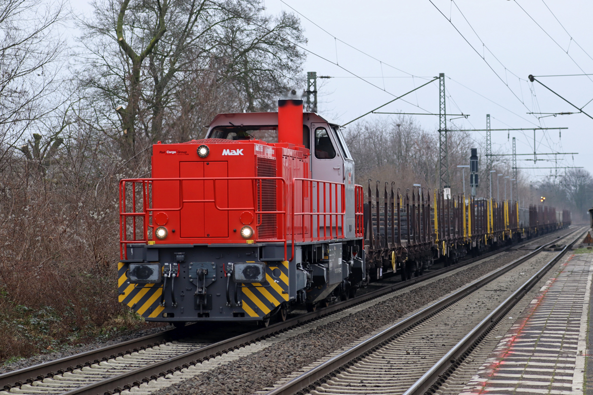 Überraschung des Tages: Rail Cargo Carrier - Germany GmbH, Köln [D] mit "223 158" [NVR: "92 80 1223 158-7 D-RCCDE"] und einem Ganzzug Schüttgutwagen mit Schwenkdach (Düngemittel) am 24.02.21 Durchfahrt Bf. Flughafen BER Terminal 5.