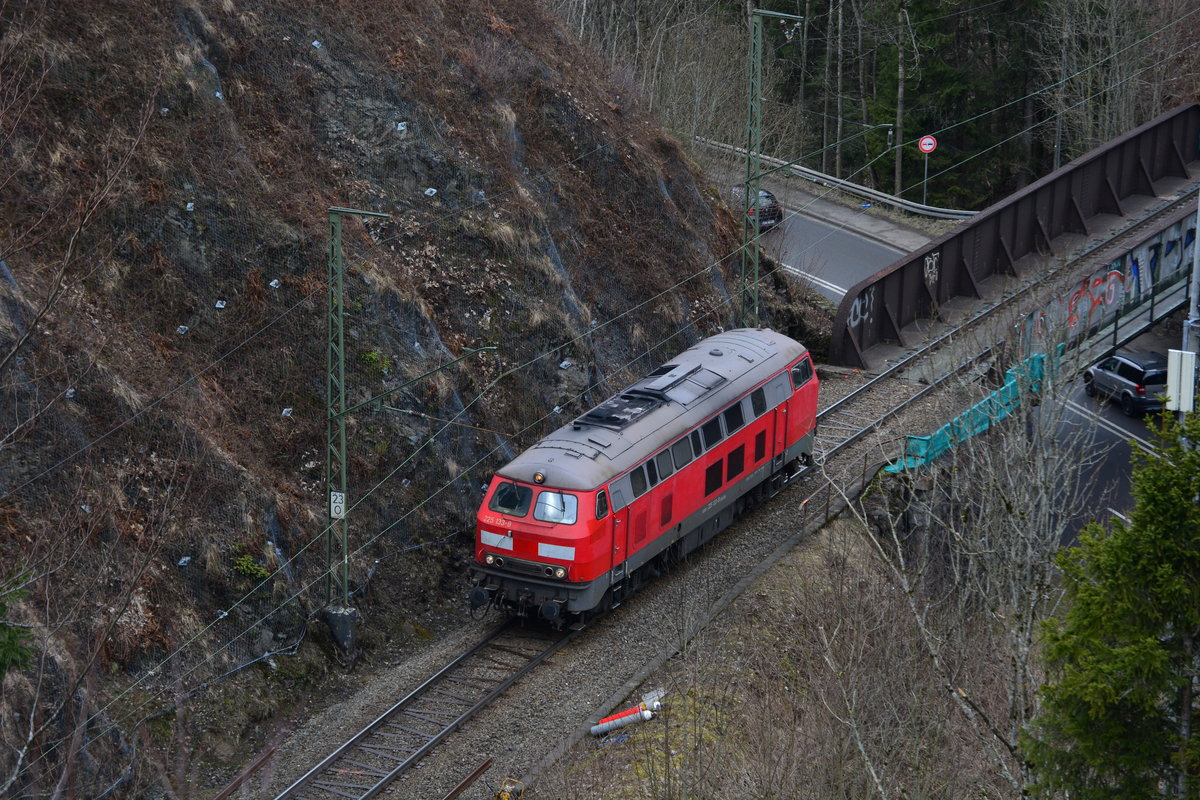 Von einem Parkplatz an den Serpentinen bei Hiterzarten konnte ich die ELBA 225 133-8 fotografieren. Sie wartet auf Einsätze auf der Großbaustelle auf der Höllentalbahn.