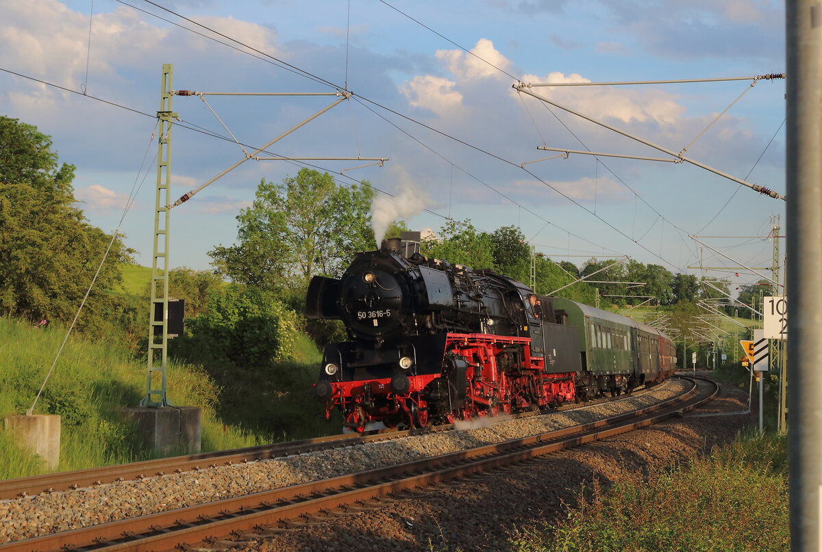 Leerreisezug mit Dampflok am Pfingstmontag den 21.05.2024 in Liebau/Pöhl mit der 50 3616. Dieser Zug kam aus Neuenmark-Wirsberg und war auf dem Weg nach Schwarzenberg/Erz. In Neuenmark fanden die jährlich zu Pfingsten stattfindenden Dampftage statt. Andreas Schreiber