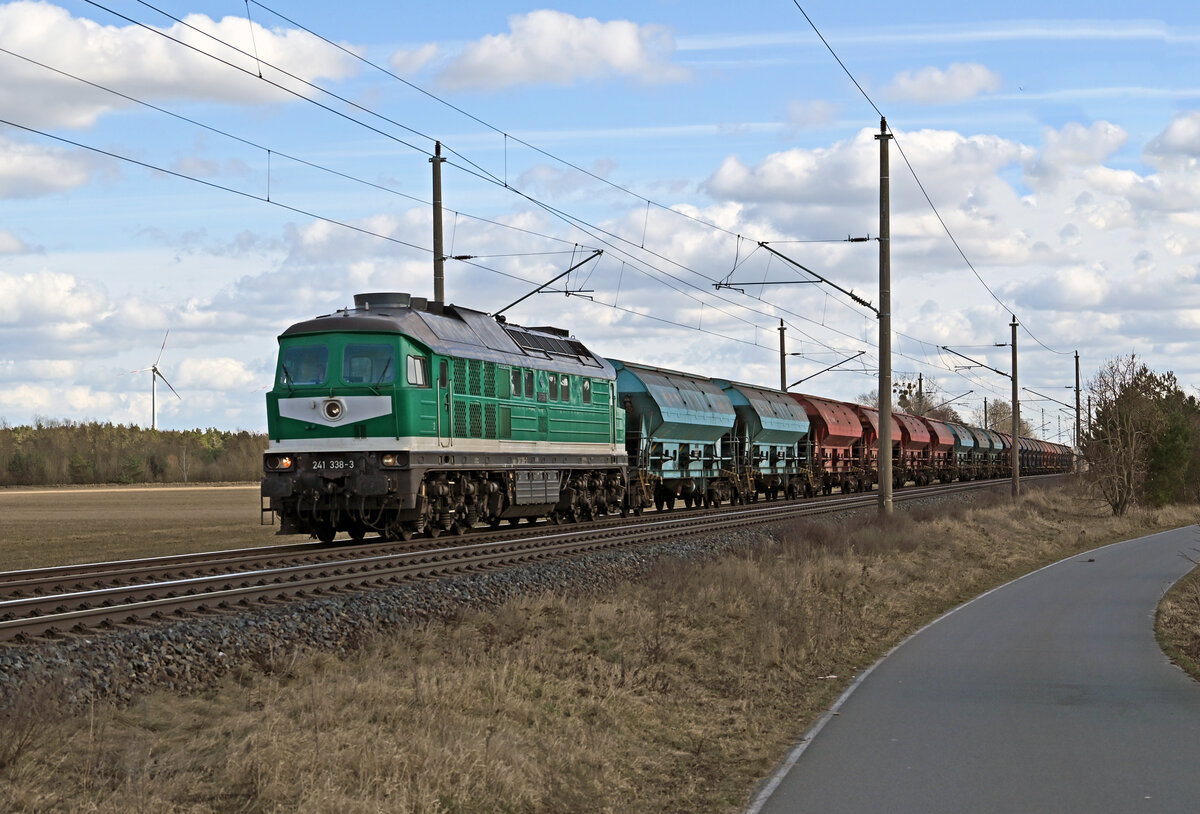 Die 241 338 kehre am 10.03.26 wieder in ihr altes Heimatgebiet zurück zur Wismutbahn Kayna nach Seelingstädt. Hier ist sie jetzt für Triangula als Ersatz einer kaputten Lok im Sandzugpendel im Einsatz. Der Sand wird von der Sandgrube für das Verfüllen eines alten Absatzbeckens benötigt. Andreas Schreiber