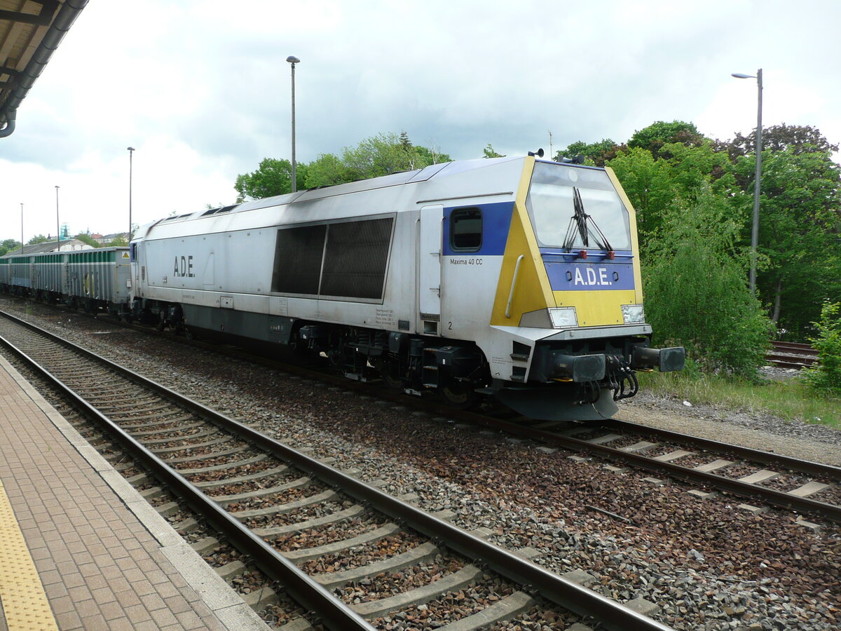 A.D.E. mit ihrer Voith Maxima 40 CC (92 80 1264 007-6 D-ADE) und einem Ganzzug offener Güterwagen bei der eiligen Durchfahrt Bf. Berlin-Hohenschönhausen.