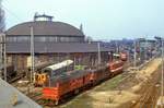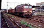 Die "Wumme" 120 255, die vor der Wende als Schiebelok in Dresden-Neustadt für die Steilrampe nach Dresden-Klotzsche eingeteilt war, kam Mitte 1988 zu Güterzugehren vor einem Zug nach Bautzen bei Dresden-Klotzsche.
