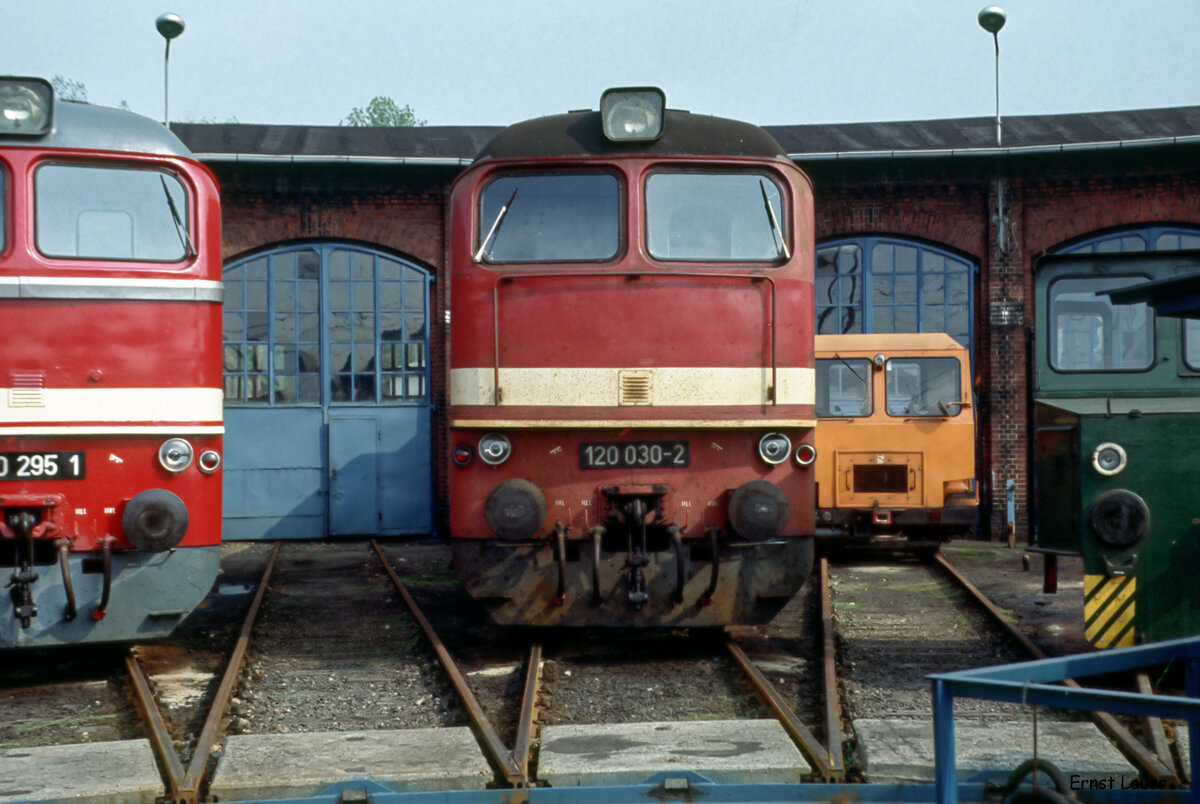 Die  Wumme  120 255, die vor der Wende als Schiebelok in Dresden-Neustadt für die Steilrampe nach Dresden-Klotzsche eingeteilt war, kam Mitte 1988 zu Güterzugehren vor einem Zug nach Bautzen bei Dresden-Klotzsche.