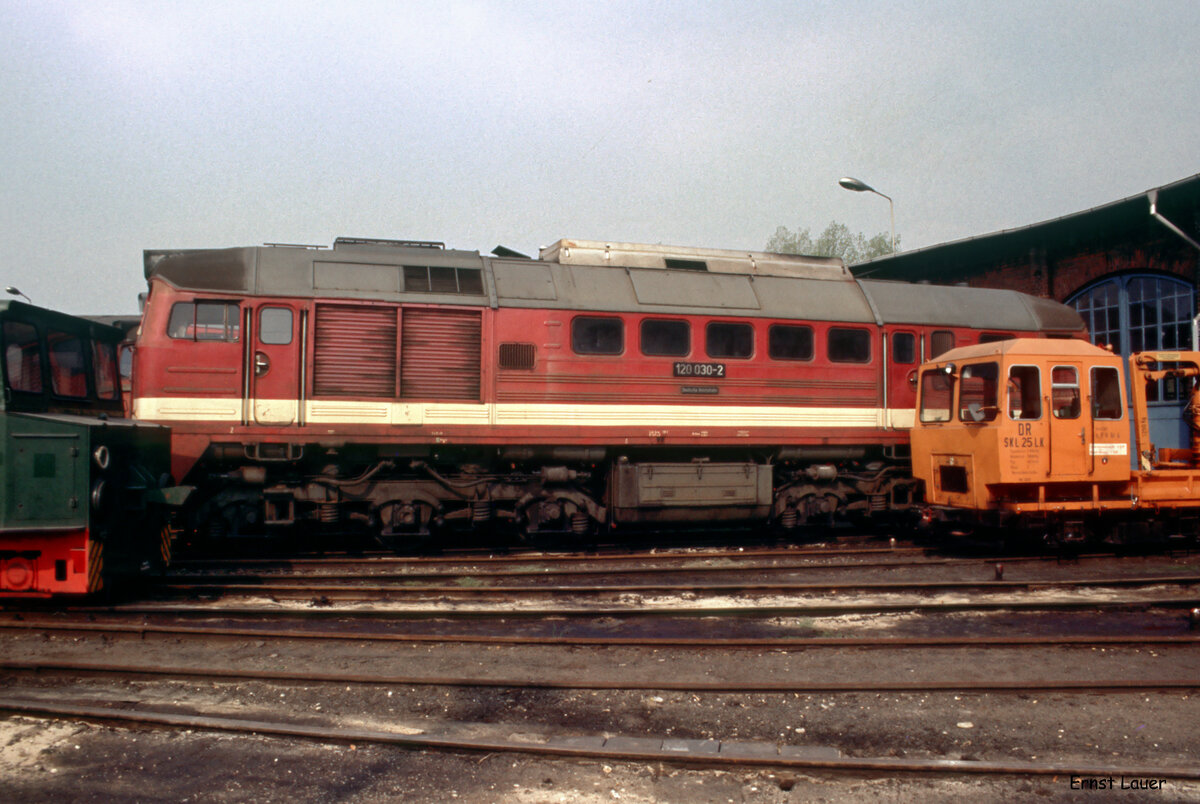 Die "Wumme" 120 255, die vor der Wende als Schiebelok in Dresden-Neustadt für die Steilrampe nach Dresden-Klotzsche eingeteilt war, kam Mitte 1988 zu Güterzugehren vor einem Zug nach Bautzen bei Dresden-Klotzsche. Rainer Haufe