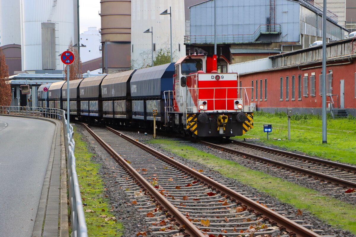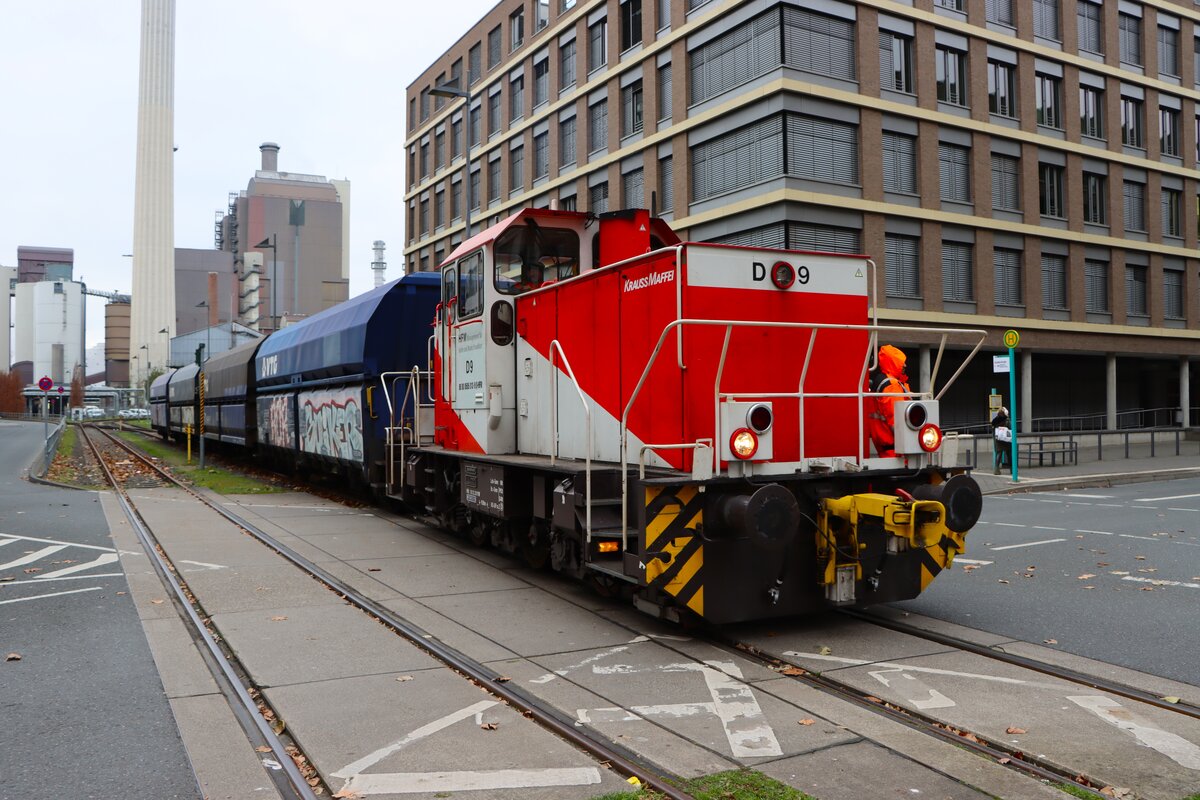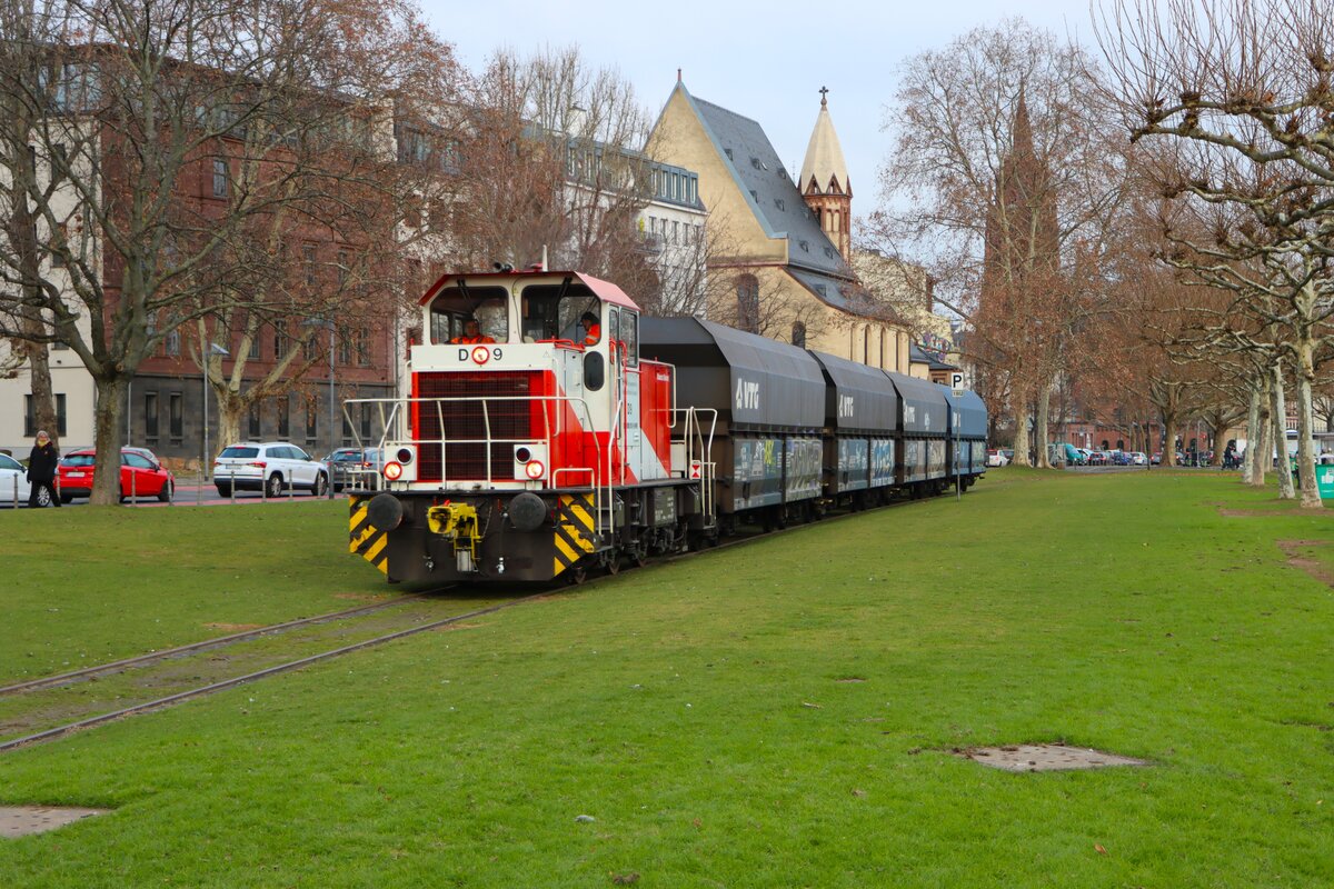 HFM Hafenbahn Frankfurt am Main Krauss Maffei MH05 Rangierlok D9 (98 80 0505 013-9) beim Rangieren am 29.12.25 in Frankfurter Westhafen von einen Gehweg aus fotografiert Daniel Oster