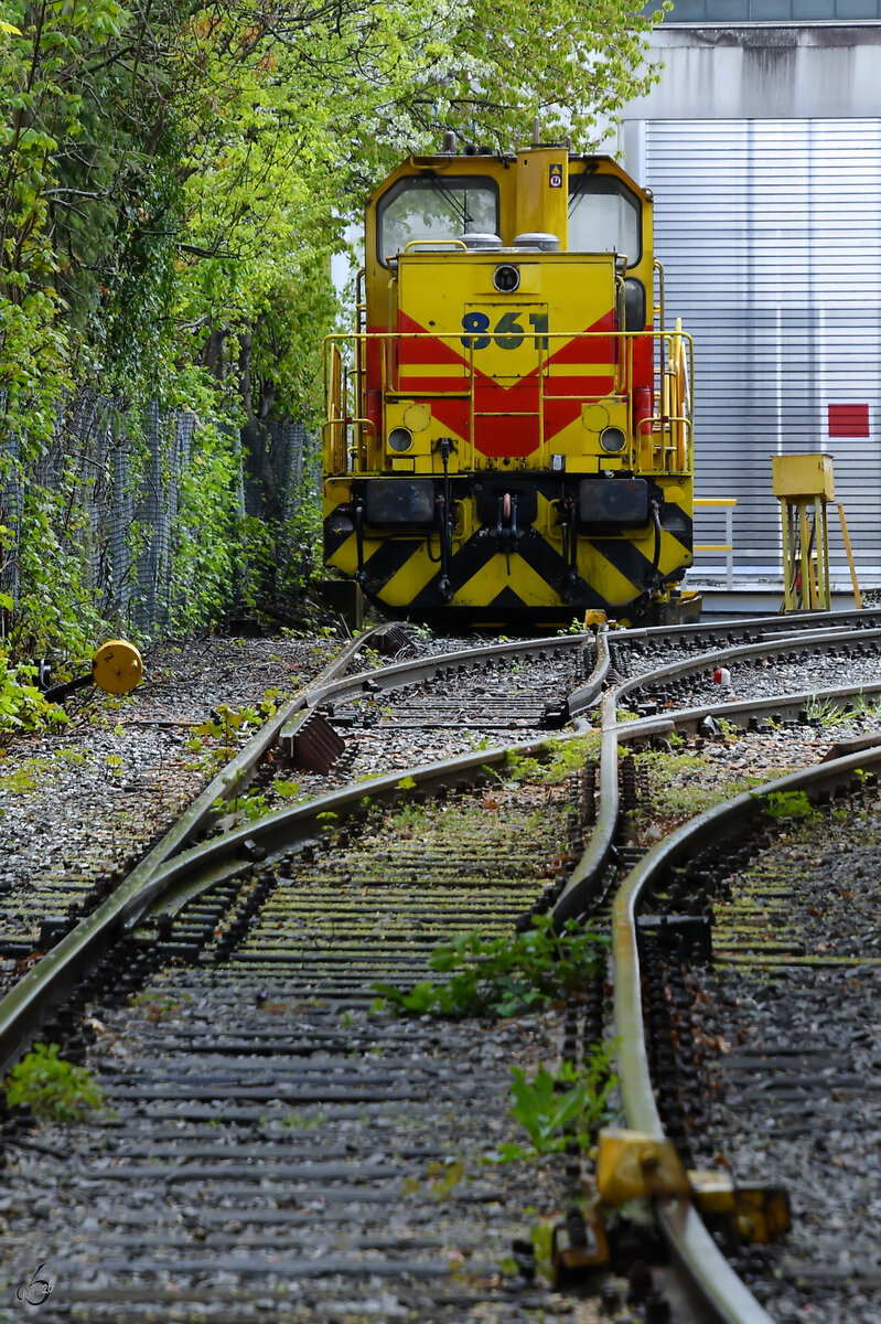 HFM Hafenbahn Frankfurt am Main Krauss Maffei MH05 Rangierlok D9 (98 80 0505 013-9) beim Rangieren am 29.12.25 in Frankfurter Westhafen von einen Gehweg aus fotografiert Daniel Oster