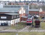 V10102 der Prignitzer Kleinbahn POLLO stand am 6.12.2024 vor einem schmucken Oldtimer Zug im Museumsbahnhof in Lindenberg.