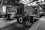 Die mit V23 082 "Riffel 15" beschilderte Rangierlokomotive wurde 1968 gebaut. (Mecklenburgisches Eisenbahn- und Technikmuseum Schwerin, März 2022)