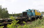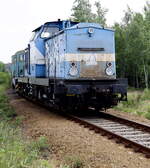 eine Werklok der WISAG wartet mit einm Bom Wagen an der Straße, um die Autos passieren zu lassen