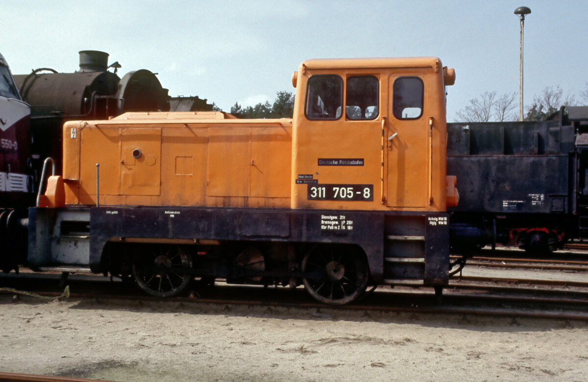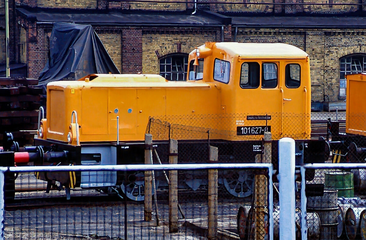 Ex DR-Kleinlok V 15 2347, 1964 gebaut von LKM, inzwischen mit der DB-Nummer 311 683 und dem Logo der DB AG, aufgenommen am 03.06.1997 im Bw. Berlin-Pankow. Nur für Statistik-Fans: Ab 1970 trug die Lok zunächst die Nummer 101 347 und später dann 101 683. Ernst Lauer