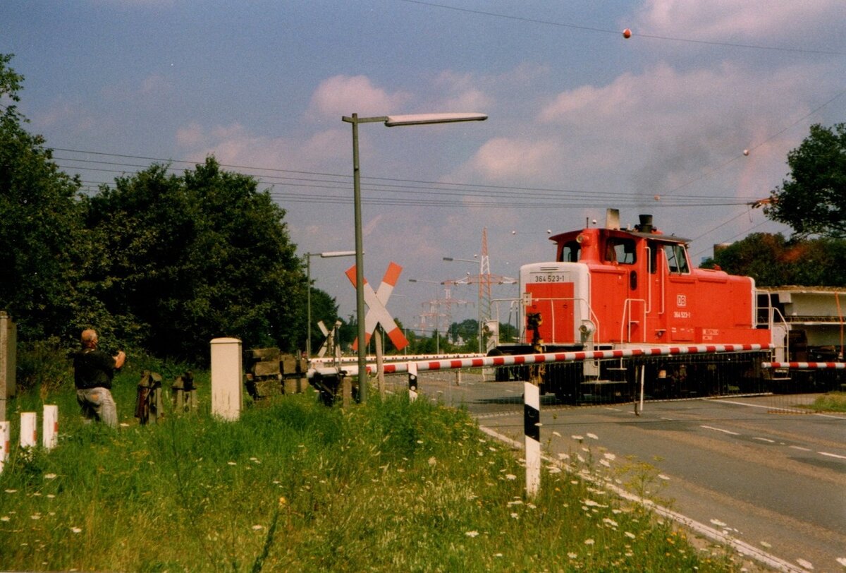 364 523 überquert im Sommer 1995 mit einer Übergabe aus Spelle (Han.) den Lingener Damm in Rheine=Altenrheine. Der Rangierlokführer kurbelt selbst die Schranken und lässt den Zug dann ferngesteuert durchfahren.