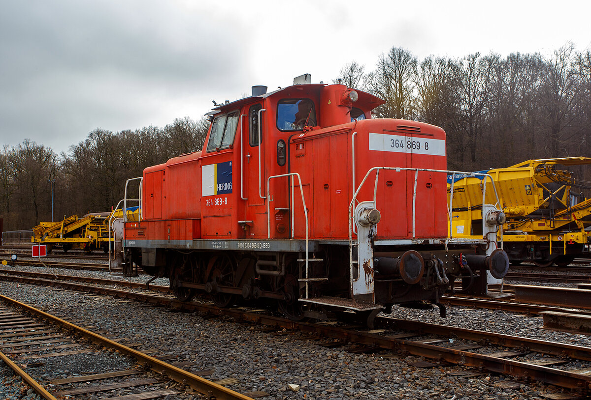 Die 364 850-8 (98 80 3364 850-8 D-VEB) der VEB - Vulkan-Eifel-Bahn Betriebsgesellschaft mbH in Gerolstein, ex DB V 60 850, ex DB 260 850-3, ex DB 360 850-3, ex SWA 364 850-8 (Stadtwerke Andernach Hafenbahn), abgestellt am 17. März 2017 in Kreuztal.