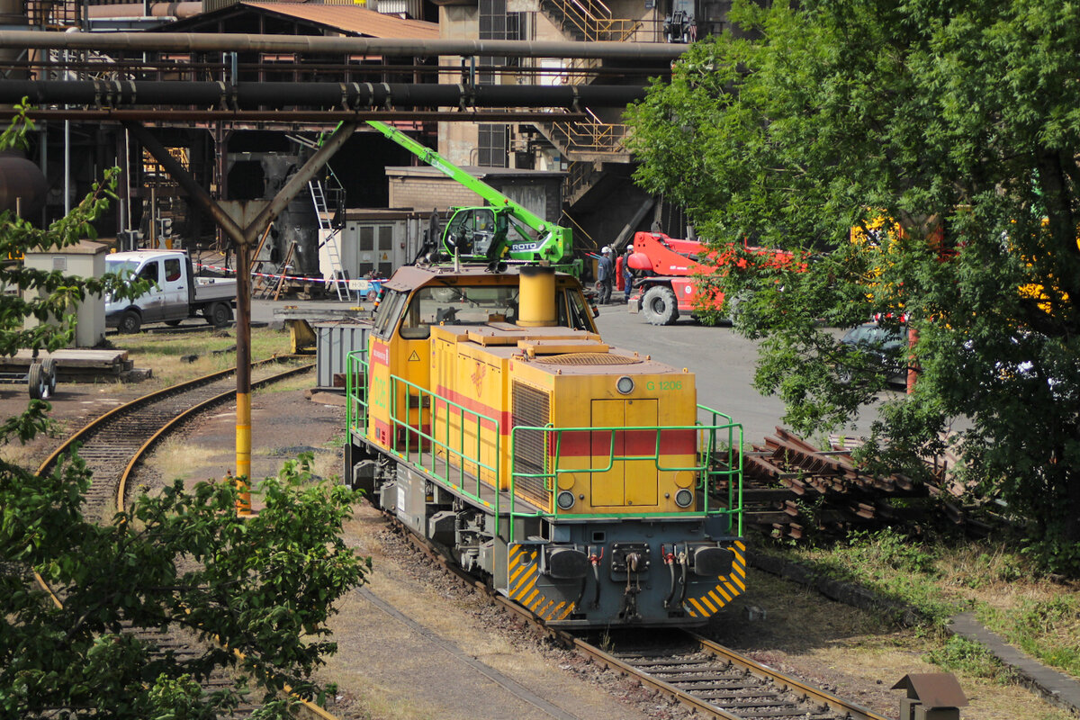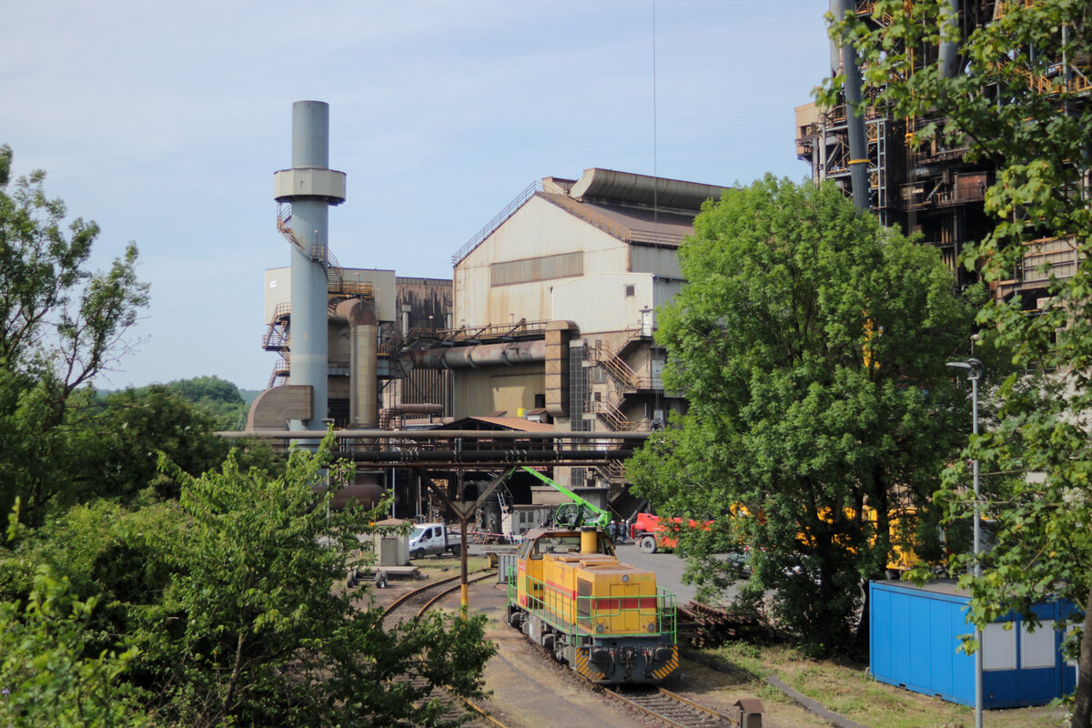 R1 (Henschel 31071/1965) und D11 (Henschel 31238/1967) stehen in der Nähe des Hochofens 4 und warten auf neue Einsätze. (Dillingen (Saar), 02.04.2025)