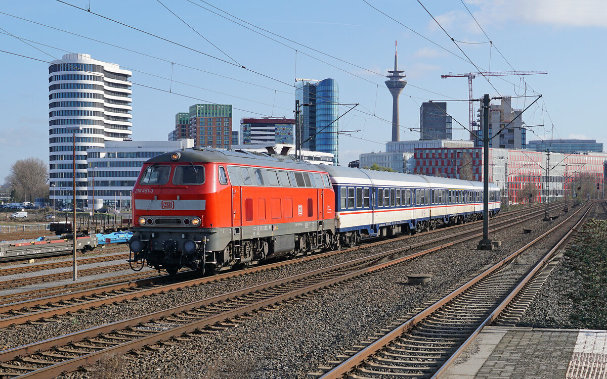 Deutschland Lok 218 451 von MZE zieht einem Personenzug, RE10 Düsseldorf - Kleve, in Kaarst Broicherseite 18/3/2026