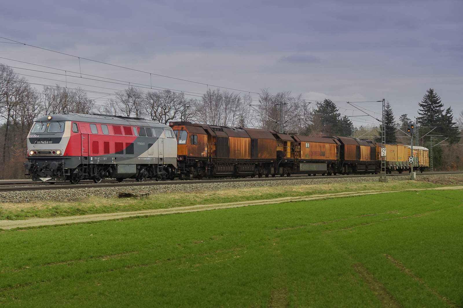 Lok 218 451 von MZE zieht einem Personenzug, RE10 Düsseldorf - Kleve, in Kaarst Broicherseite