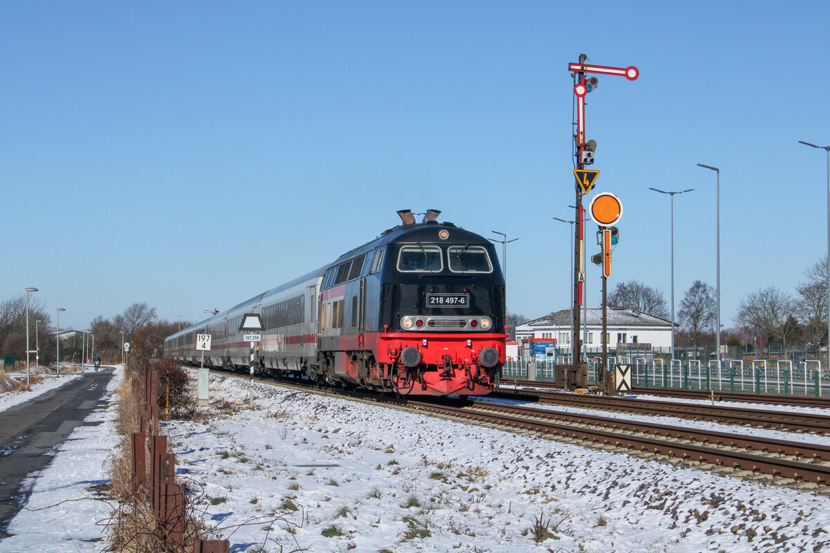D-DB 218 397-8 zog am 07.02.2026 ihren IC 2263 von Rostock Hbf (WR) nach Hamburg Hbf (AH). Hier bei der Einfahrt in den Lübecker Hbf (AL).