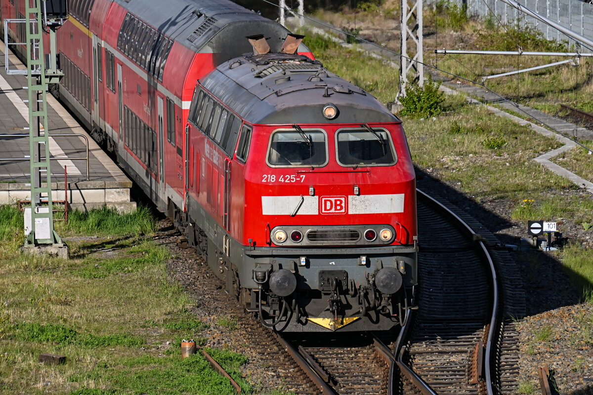 D-DB 218 425-7 fuhr am 26.04.2026 mit ihrer Wagengarnitur in die Abstellung des Lübecker Hbf (AL). Zuvor kam sie mit dem RE 2 (RE 56864) aus Bad Kleinen (WK) nach Lübeck Hbf (AL).