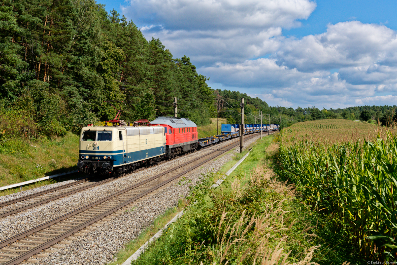 181 213 SEL und 234 278 SEL mit einem Betonteilezug bei Hagenbüchach Richtung Würzburg, 01.09.2021