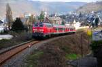 Mit einem freundlichen Dank fürs "Bewachen" der Kamera... dröhnt die Regionalbahn aus dem Rheintal zu Boppard in den Hunsrück hinauf. (April 2009).