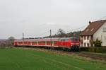 218 452 mit einer RB bei Markt Schwaben in Richtung München Ost am 10.3.2026. Dieser Zug pendelte diesen ganzen Tag wieder zwischen München Ost und Mühldorf. Ganz hübsch da oben auf dem Damm. Die Strecke soll mal 2 Gleisig werden, da muss dann sicherlich viel Material angekarrt werden um das Volumen aufzufüllen.