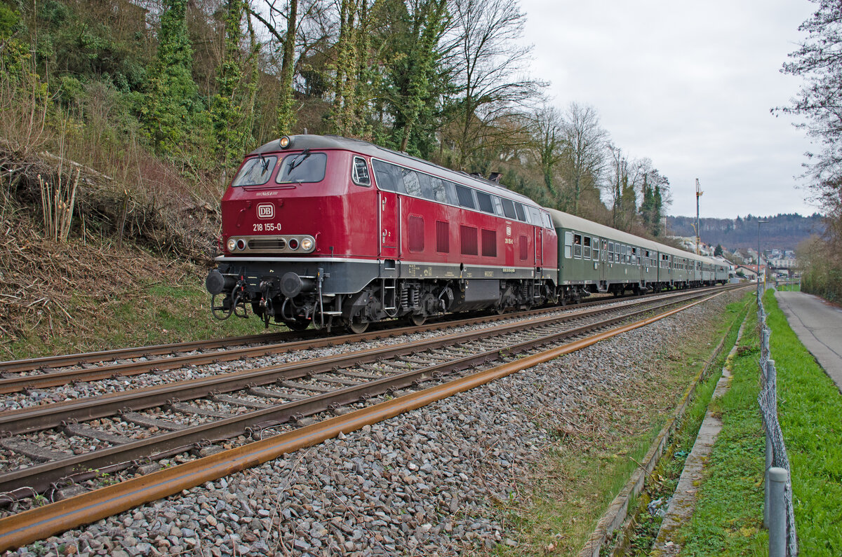 Sonntag den 15.03.2026 um 10:03 Uhr in Waldshut-Tiengen (D). Abschiedsfahrt von der Dieseltraktion auf der Hochrheinbahn. Westlich vom Bahnhof Waldshut unmittelbar nach der Ausfahrt (bei Bahnkilometer 324,000) fährt ein Sonderzug von Singen (Htw) nach Basel Bad Bf. Es ist der RE 83591 welcher für alle  Normalzahlenden“ zugänglich ist (Gültiger Fahrausweis genügt). Er verkehrt als öffentlicher Reisezug. Zugskomposition; Lok: NeSA 218 155-0 (UIC 92 80 1218 155-0 D-NESA), 1. Wagen: 40451 Stg B4nb (22 40 451 Bn) der EFZ, 2. Wagen: 56 80 2240 024-2 D-NESA Bn, 3. Wagen: 56 80 3240 001-8 D-NESA ABn, 4. Wagen: 55 80 2250 099-2 D-NESA BDms. Singen ab um 09:00 Uhr, Waldshut ab um 09:50 Uhr, Basel Bad Bf an um 10:31 Uhr. Hier in Waldshut ist er momentan zirka 12 Minuten verspätet. NeSA = Bahnbetriebsgesellschaft, über den die Eisenbahnfreunde ihre Touristik- und Nostalgiefahrten abwickeln. EFZ = Eisenbahnfreunde Zollernbahn e.V. Koordinaten GMS (Grad, Minuten, Sekunden): N 47° 37’ 19.5’’ O 8° 12’ 1.1’’