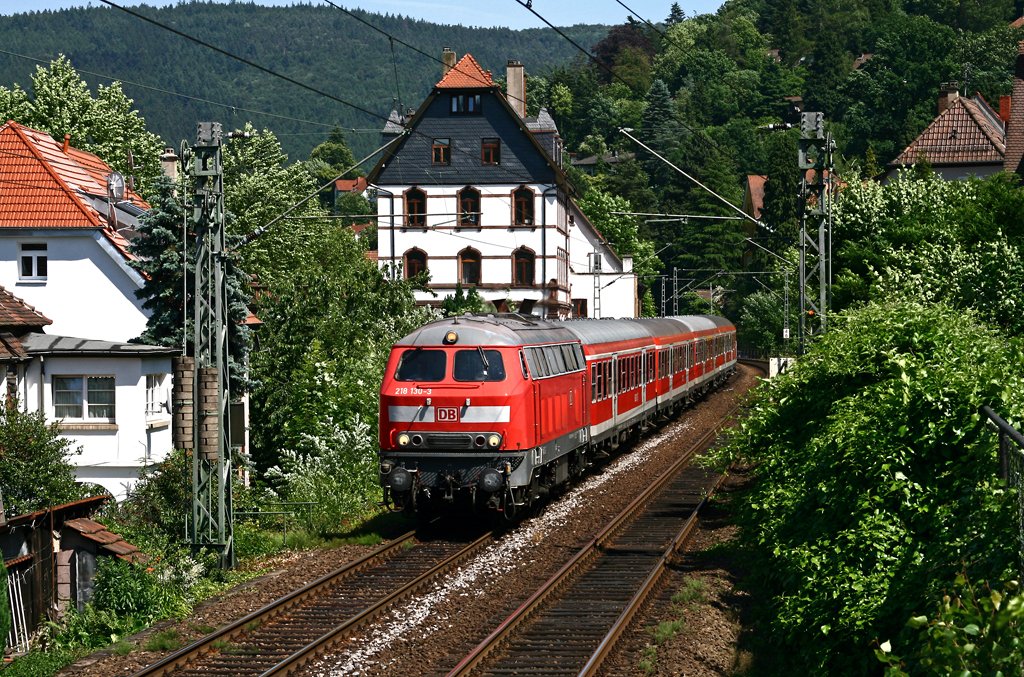 Mit zu den ältesten nach wie vor eingesetzten Loks der Baureihe 218 gehört die Karlsruher 218 130 . Am 5. Juni hatte die mittlerweile 38 Jahre alte Lok die Aufgabe, den RE 4838 von Heilbronn nach Mannheim zu befördern und rollt zur Mittagszeit dabei durch den Heidelberger Stadtteil Schlierbach.