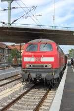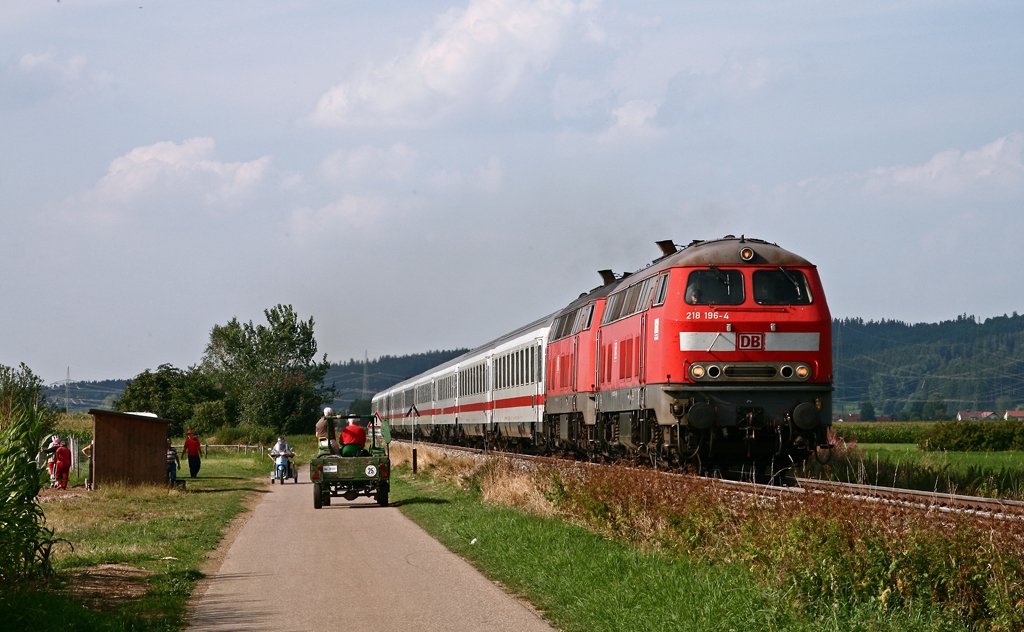 Rund 25 Minuten verspätet eilen 218 196 und 218 434 vom Betriebshof Ulm am Abend des 7. August 2009 mit dem IC | RE 2013 „Allgäu“ von Hannover nach Oberstdorf bei Bad Grönenbach in Richtung Kempten (Allgäu).