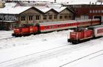 218 426 schiebt am 31.1.2010 ihren RE bei Hopferau an der KBS 974 Richtung Biessenhofen.