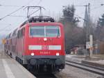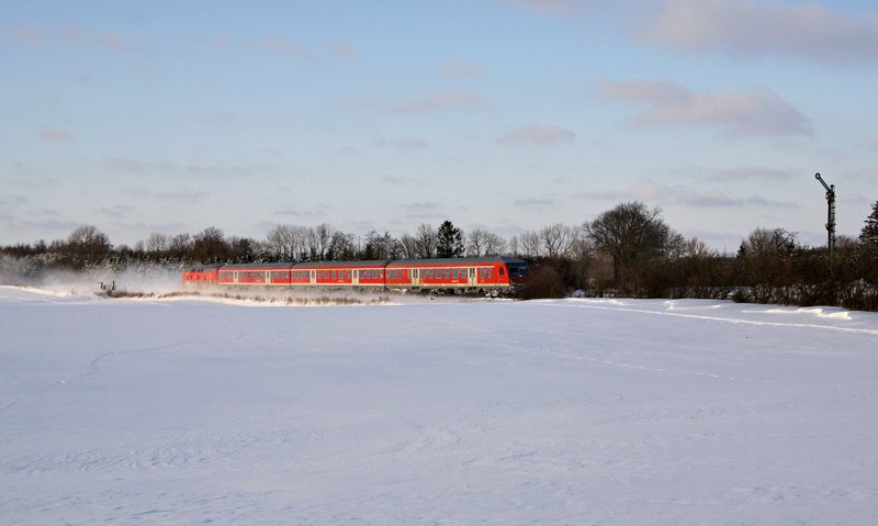 218 329-1 schiebt am 11.02.2010 eine Wendezuggarnitur als RB nach Kiel Hbf am Neuwittenbeker ESig vorbei. Der Schnee hat es in dieser Region schon auf gut 40 cm Höhe gebracht, was das Gehen auf ungeräumten Wegen sehr erschwert.