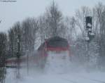 Am wetterbedingt etwas traurigen 16.Februar 2026 treft 218 321 mit der IC aus Westerland (Sylt) in Niebüll ein.