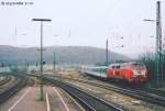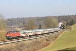 RE 57512 von München nach Füssen, bespannt vermutlich mit 218 488, auf der Lechbrücke in Kaufering. Im Hintegrund die Wallfahrtskirche St. Leonhard. 14.03.2012
