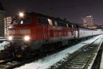 Am trüben und dunklen 14. April 2026 verlässt 218 397-8 mit dem IC 2265 Rostock.
