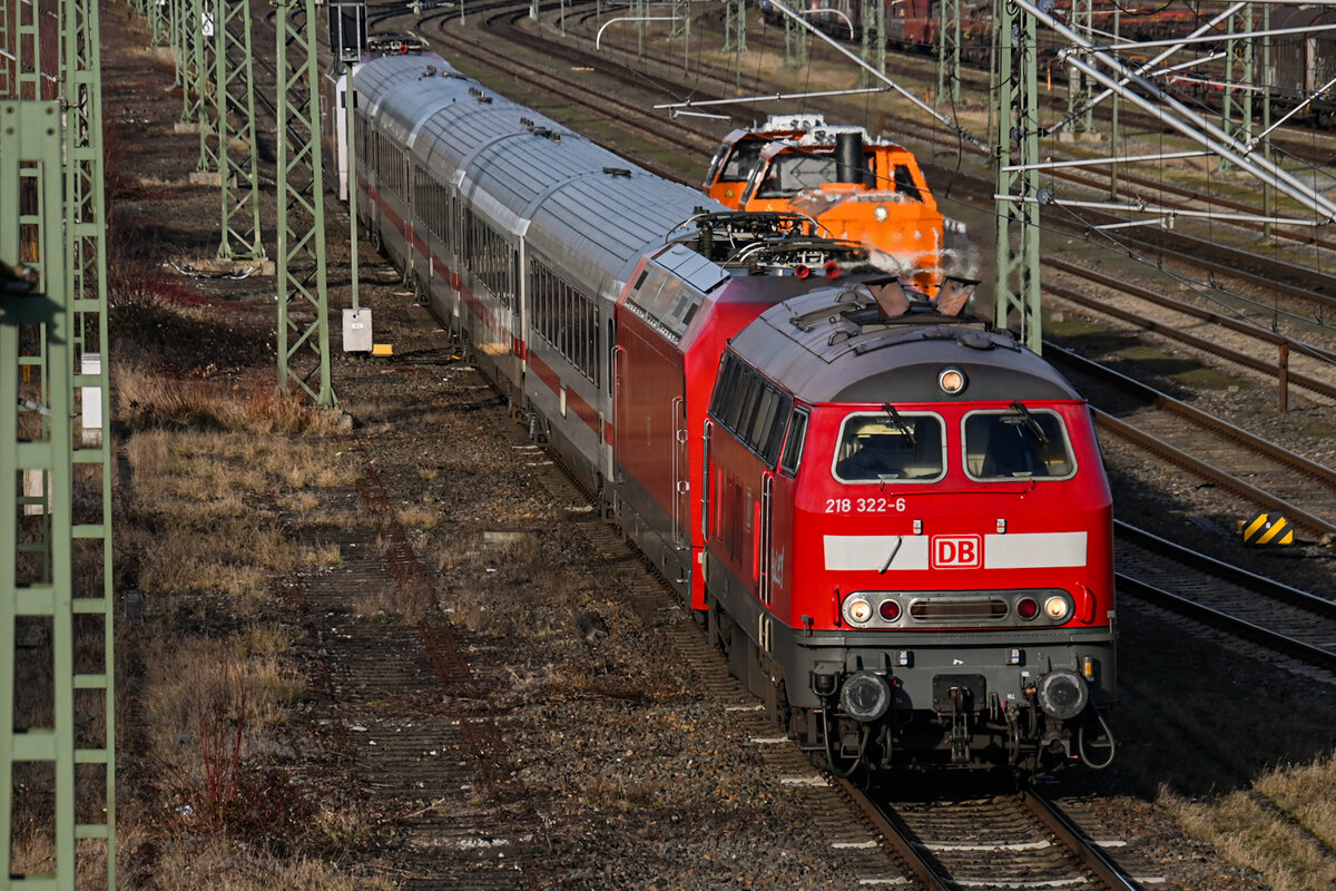 D-DB 218 322-6 zog am 16.01.2026 ihren IC 2262 von Lübeck Hbf (AL) nach Ostseebad Binz (WBI) bzw. Bad Kleinen (WK). Aufgrund eines Fahrzeugausfalls verkehrte dieser Intercity ohne Steuerwagen. Deswegen wurde IC 2262 auf den Elektrifizierten Strecken von D-DB 101 118-8 und D-DB 101 110-5 (50 Jahre IC) gefahren.