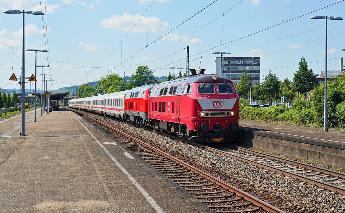MEMMINGEN, 29.04.2025, DB 218 411-7 als IC 2012 nach Ulm Hbf bei der Einfahrt in den Bahnhof Memmingen