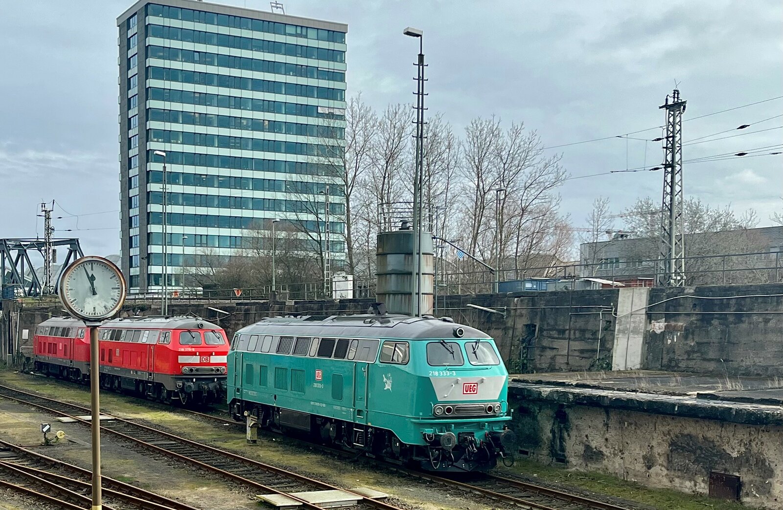 Die 218 451-3 (92 80 1218 451-3D-MZE) der MZE - Manuel Zimmermann Eisenbahndienstleistungen, Hellenhahn-Schellenberg (Ww), hat am 11 November 2025 im Bahnhof Kirchen/Sieg in Richtung Betzdorf fahrend kurz Hp 0. Die V 164 wurde 1978 bei Henschel in Kassel unter der Fabriknummer 32045 gebaut und als 218 451-3 an die DB geliefert. Bis April 2016 fuhr sie für die DB Regio AG – Nord als 92 80 1218 451-3 D-DB im Regionalbahn Einsatz in Niedersachsen und Bremen. Im Jahr 2016 ging sie dann an die LWC Lappwaldbahn Cargo GmbH in Braunschweig und war Ende 2021 an die Hering Bau GmbH & Co. KG in Burbach vermietet. Im Juni 2023 wurde sie dann an die MZE - Manuel Zimmermann Eisenbahndienstleistungen verkauft. Die Baureihe 218 ist das zuletzt entwickelte Mitglied der V 160-Lokfamilie. Viele Gemeinsamkeiten der Baureihen V 160 bis V 169 (spätere 215 bis 219) wurden in ihr zusammengefasst. Bei der Baureihe 218 wurde von der Baureihe 217 die elektrische Zugheizung übernommen, von den Prototypen der Baureihe 215 übernahm man den 1.840-kW-Motor (2.500 PS), wobei ein Hilfsdieselmotor zum Betrieb des Heizgenerators überflüssig wurde. Später wurden noch stärkere Motoren mit 2.700 PS (KHD Lizenzbau Pielstick16 PA4 V 200) oder mit 2.800 PS (MTU 12 V 956 TB 11) verbaut. Den verbauten Motor kann man anhand der Anordnung der Abgashutzen auf dem Dach erkennen. Im Jahr 1966 bestellte die Deutsche Bundesbahn zunächst zwölf Vorserien-Lokomotiven der Baureihe V164. Die ersten Lokomotiven wurden ab 1968 von der Firma Krupp ausgeliefert. Von der Deutschen Bundesbahn wurden sie aber als Baureihe 218 in Dienst gestellt. Die Serienbeschaffung (unter Beteiligung von Henschel, Krauss-Maffei und MaK in Kiel) erfolgte von 1971 bis 1979 mit 398 weiteren Maschinen. Hinzu kam 1975 nach einem Unfall die 215 112, die nach ihrer Instandsetzung zur 218 399 wurde. Die Auslieferung erfolgte in vier Bauserien (218 101-170, 171-298, 299-398, 400-499), bei denen es geringe Veränderungen gab. Die 140 km/h schnellen und 2.500 bis 2.800 PS starken ''BB-Loks“ wurden im Reise - und Güterzugdienst eingesetzt. Die elektrische Zugheizung und die Wendezug- und Doppeltraktionssteuerung machen die Baureihe 218 zu einer universal verwendbaren Lok. Die Baureihe 218 bewährte sich im Betriebsdienst und galt noch bis ins Jahr 2000 als die wichtigste Streckendiesellok der Deutschen Bahn AG. Leider wurden immer mehr Leistungen im Personennahverkehr durch Triebwagen ersetzt. Dadurch und durch Betreiberwechsel waren immer mehr Lokomotiven der Baureihe 218 bei der Deutschen Bahn AG überflüssig geworden. Im Juli 2009 waren noch etwa 200 Exemplare im Einsatz. Eine echte Nachfolgerin für die Baureihe 218 ist noch nicht in Sicht. TECHNISCHE DATEN: Spurweite: 1.435 mm (Normalspur) Achsformel: B'B' Spurweite: 1.435 mm Länge: 16.400 mm Breite des Lokkastens: 3.136 mm Höhe des Lokkastens: 4.275 mm über Schienenoberkante Drehzapfenabstand: 8.600 mm Achsabstand im Drehgestell: 2.800 mm Treibraddurchmesser: 1 000 mm (neu) / 920 mm (abgefahren) Gewicht: 79 Tonnen Achslast: 19,5 t Motor: MTU wassergekühlter V12-Zylinder-Viertakt -Dieselmotor vom Typ 12 V 956 TB 11 (abgasoptimiert) mit Direkteinspritzung, Abgasturboaufladung und Ladeluftkühlung Motorleistung: 2.800 PS (2.060 kW) bei 1,500 U/min Motor-Hubraum: 114,7 Liter Anfahrzugkraft: 235kN Dauerzugkraft: 175kN Höchstgeschwindigkeit: 140 km/h (im Langsamgang 100 km/h) Motorleerlaufdrehzahl (ohne Zugheizung): 630 - 650 U/min Motorleerlaufdrehzahl (mit Zugheizung): ca. 1.000 U/min Kleinste Dauergeschwindigkeit (im Schnellgang): ca. 28 km/h Kleinste Dauergeschwindigkeit (im Langsamgang) ca. 18 km/h Getriebe: MTU-Getriebe K 252 SUBB (mit 2 hydraulische Drehmomentwandler) Leistungsübertragung: hydraulisch Kleinster befahrbarer Gleisbogen: R = 100 m Tankinhalt: 3.150 l Sandvorrat: 400kg Bremse: KE-GPP2R-H mZ Bemerkung: Den verbauten Motortyp kann man auch anhand der Anordnung der Abgashutzen auf dem Dach erkennen. Aufbau und Ausrüstung: Motor und Getriebe sind elastisch im Rahmen gelagert. Der Rahmen stützt sich über je vier Schraubenfedern pro Drehgestell und Seite auf die Drehgestelle ab. Ab 218 299 wurden dabei Flexicoil-Federn verwendet, die eine gleitstücklose Bewegung der Drehgestelle ermöglichen (Atlas-MaK-Drehgestelle). Zug- und Bremskräfte werden über tiefliegende Querträger mit Drehzapfen übertragen. Die Aufbauten sind in Schalenbauweise aus Blechen und Profilstahl gefertigt. Zwischen den beiden Endführerständen verlaufen zwei Seitengänge. Der Antrieb erfolgt über vier sehr lange Gelenkwellen von einem zentral liegenden Strömungsgetriebe mit Wendegetriebe. Dieses Getriebe ist mit zwei Drehmomentwandlern ausgerüstet. Die Schaltung von Wandler I auf Wandler II erfolgt automatisch und ohne Zugkraftunterbrechung. Außerdem ist das Getriebe mit zwei Geschwindigkeitsstufen ausgerüstet. Die kleine Geschwindigkeitsstufe (Langsamgang) ermöglicht höhere Zugkräfte, allerdings eine niedrigere Endgeschwindigkeit von 100 km/h, die große Geschwindigkeitsstufe (Schnellgang) erlaubt die höhere Höchstgeschwindigkeit von 140 km/h, jedoch mit niedrigeren Zugkräften. Die Umschaltung von Langsam- auf Schnellgang erfolgt ausschließlich bei stehender Lokomotive. Zudem sind die Serienlokomotiven mit einer verschleißfreien hydraulischen Bremse ausgerüstet. Im Laufe der Zeit wurden verschiedene Dieselmotoren als Antrieb eingesetzt: Die ersten Serien erhielten den MTU MA 12V 956 TB10 mit 2.500 PS. Um den bei diesen Motoren eintretenden Zugkrafteinbruch bei voller Heizleistung zu umgehen, wurden bei späteren Maschinen einige von KHD in Lizenz gebaute französische Pielstick 16 PA4 V200 mit rund 2,700 PS eingebaut. MTU zog nach und entwickelte aus dem TB10 den 2,800 PS leistenden stärkeren TB11, der in weit mehr als der Hälfte aller 218 zum Einbau kam. Durch schlechte Abgaswerte und fortschreitenden Verschleiß der Motoren sah sich der Betreiber in den letzten Jahren zu einem umfassenden Moder