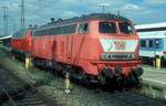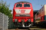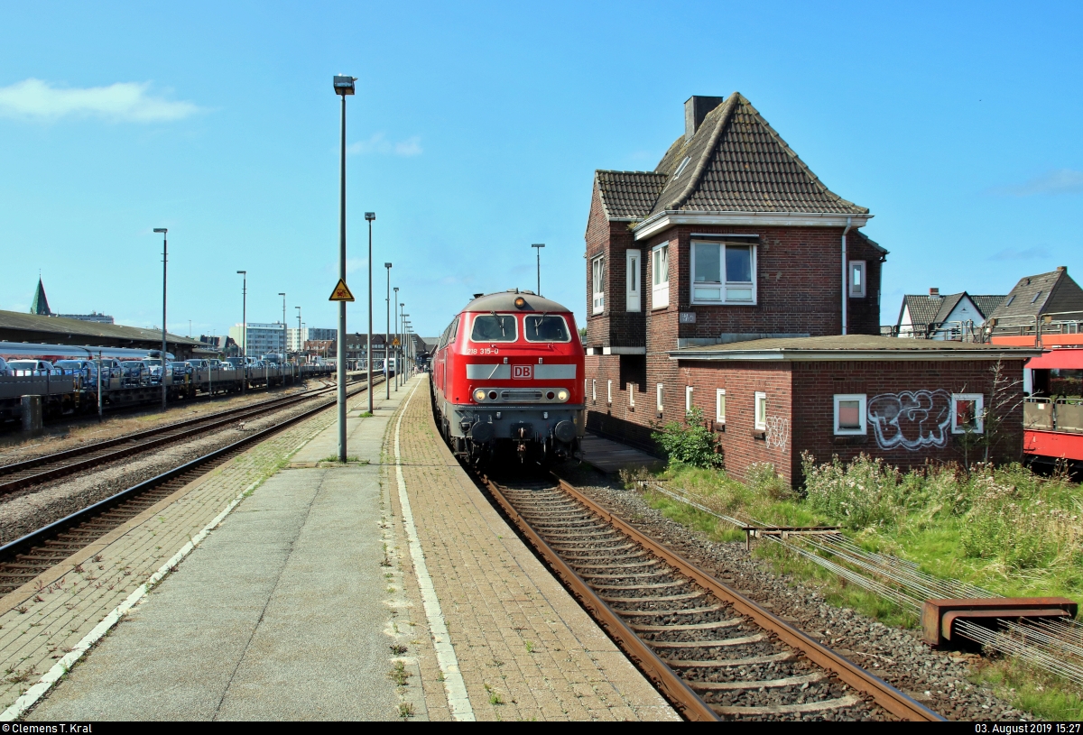218 315-0 und 218 ??? der DB Fernverkehr AG als IC 2073 "Uthlande" (Linie 27) nach Berlin Hbf (tief) stehen neben dem mechanischen Stellwerk Wla, Einheitsbauart, des Fahrdienstleiters (Fdl) im Startbahnhof Westerland(Sylt) auf Gleis 1.