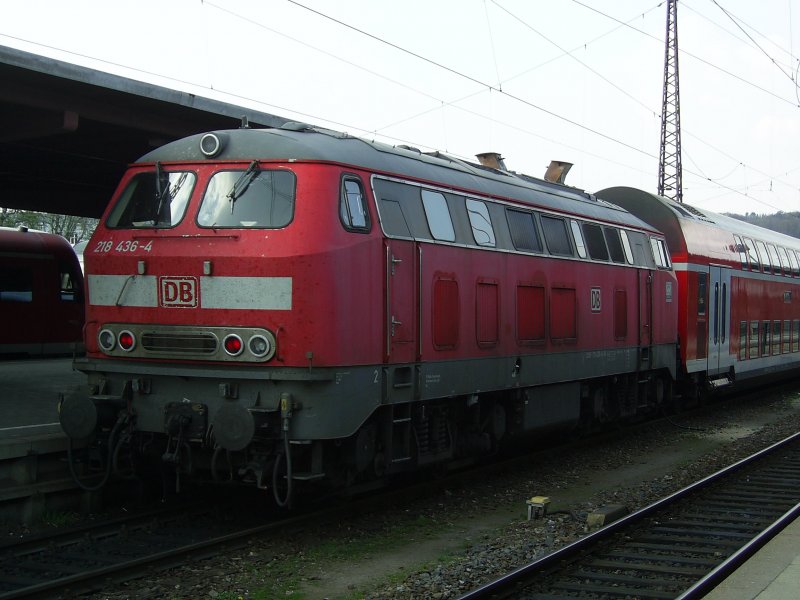 218 436-4 hängt am 14.4.2009 noch an ihrem Südbahn-IRE. Wenig später setzt sie ab und eine Werbe-146 bringt den Zug in den Zielbahnhof Stuttgart.