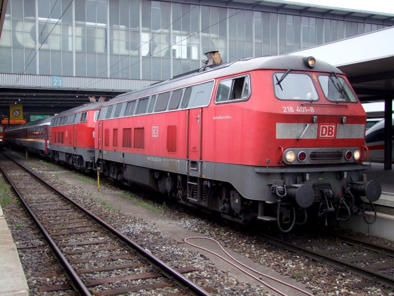 218 401-8 und deren Schwester 426-5 verlassen soeben mit EC 192 das Gleis23 am Münchner Hbf.; 090515
