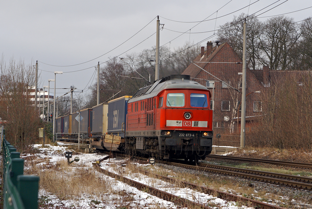 Aufgrund einer Entgleisung eines Güterzuges in Dänemark wurden über einen Zeitraum von 2 Wochen einige Güterzüge von Dänemark nach Maschen über die Marschbahn umgeleitet. Bespannt wurden die Züge von Tønder bis Maschen mit Lokomotiven der Baureihen 232 und 233. Am südlichen, elektrifizierten Teil der Marschbahn konnte am 15.12.2012 232 673-4 mit einem Zug des Kombinierten Ladungsverkehr in Glückstadt aufgenommen werden.