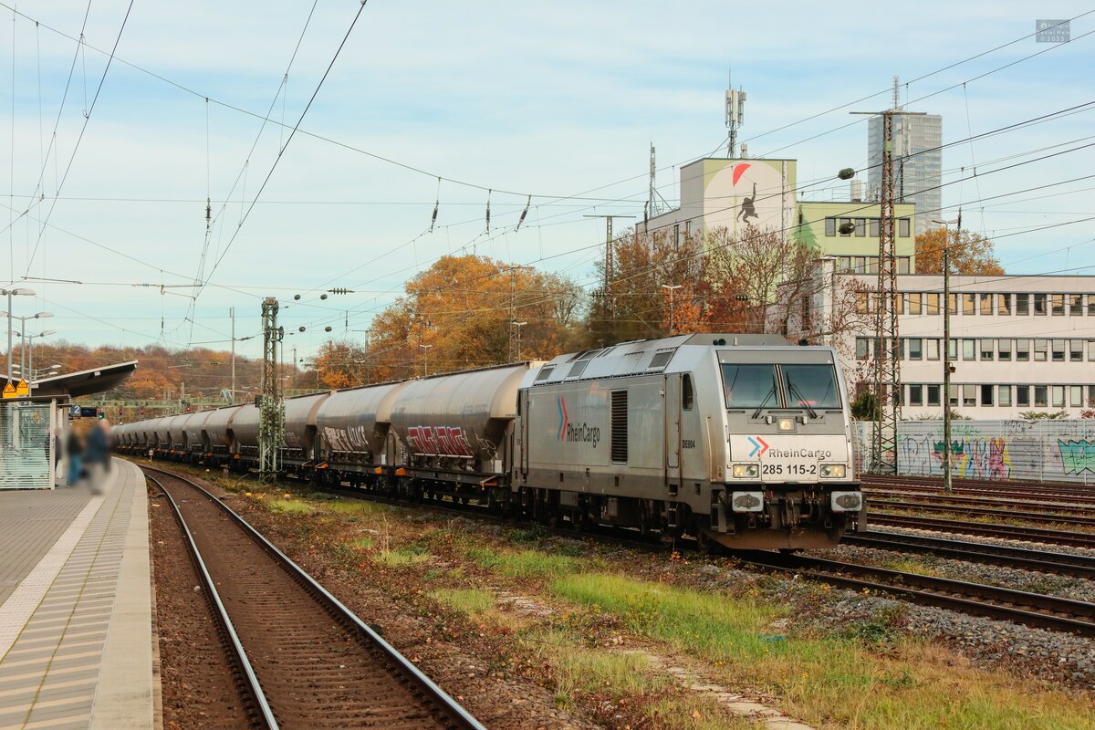 Die 285 114-5/DE 803 (92 80 1285 114-5 D-RHC) der RheinCargo fährt am frühen Morgen des 21 Januar 2025 (8:05 Uhr), auf Tfzf (Triebfahrzeugfahrt) durch den Hauptbahnhof Köln, in Richtung Deutz. Die TRAXX F140 DE wurde 2013 von der Bombardier Transportation GmbH in Kassel unter der Fabriknummer 34844 gebaut und als 92 88 00 76 105-0 B-BTK an die BTK Bombardier Transportation GmbH (Kassel) geliefert bzw. eingelagert. Sie war wohl wie vier weitere für einen anderen Kunden vorgesehen. Im Herbst 2013 übernahm der Betreiber RheinCargo aus Neuss die Lieferung der fünf eingelagerten neuen Traxx F140 DE Lokomotiven (76 103-107). Die ersten drei Loks (ex 76 103, 104 und 105) wurden am 01.10.2013 zu den ex HGK-Werkstätten (HGK ist heute Teil der RheinCargo) in Brühl-Vochemon transportiert. Nach einigen Tests und neuen Rheincargo-Logos wurden die drei Maschinen am 21.11.2013 offiziell vorgestellt. Die Lokomotiven TRAXX F140 DE sind die aus der Plattform Traxx 2e des Herstellers Bombardier hervorgegangene Mehrzweck-Dieselversion. Sie sind mit einem 2.200 kW (3.000 PS) starken MTU 16V 4000 R41L Dieselmotor und elektrischer Wechselstrom-Kraftübertragung ausgestattet, so dass sie eine Anfahrzugkraft von 270 kN und eine maximale Betriebsgeschwindigkeit von 140 km/h erreicht. Diese Lokomotiven sind beliebt bei Unternehmern, die elektrische Traxx-Flotten im Betrieb haben, aber für Strecken mit langen, nicht elektrifizierten Abschnitten zuverlässige Zugkraft brauchen. TECHNISCHE DATEN der BR 285 (TRAXX F140 DE): Hersteller: Bombardier Transportation Baujahre: 2007 bis 2013 (35 Stück) Spurweite: 1.435 mm Profil: UIC 505-1 Achsfolge: Bo´Bo´ Länge über Puffer: 18.900 mm Drehzapfenabstand: 10.440 mm (virtuell) Achsabstand im Drehgestell: 2.600 mm Treibraddurchmesser: 1.250 mm (neu) / 1.170 mm (abgenutzt) Breite: 2.977 mm Höhe: 4.264 mm Dienstgewicht: 82 t Maximale Geschwindigkeit: 140 km/h Anfahrzugkraft: 270 kN Dauerzugkraft: 240 kN ab 26 km/h Dieselmotor Hersteller: Motoren- und Turbinen-Union, Friedrichshafen (MTU) Dieselmotor Art/Typ: wassergekühlter V-16-Zylinder- 4Takt-Dieselmotor mit zweistufiger Turboaufladung und Ladeluftkühlung, sowie mit Common-Rail-Einspritzsystem vom Typ MTU 16V 4000 R41L Der Motor schaltet im Leerlauf 8 der 16 Zylinder ab, um den Spritverbrauch und Schadstoffausstoß zu senken. Motor-Hubraum: 76,265 l (Bohrung 170 mm, Hub 210 mm) Motorgewicht: 7.930 kg (trocken) / 8.510 kg (nass) Dieselmotorleistung: 2.200 kW (3.000 PS) bei 1.800 U/min Kraftübertragung: dieselelektrisch Traktionsmotoren: 4 Stück Drehstrom-Asynchronmotor Leistung am Rad: 1.825 kW Antrieb: Tatzlagerantrieb Bremskraft: 150 kN Elektrische Bremsleistung: max. 1.000 kW Tankvolumen: 5.000 l Bauart der Bremsen: Druckluftbremse, Feststellbremse, Dynamische Bremse Kleister befahrbarer Gleisbogen: R = 100 m Zugsicherung: GSM-R, PZB90 Bremsgewicht: P 90 G 77