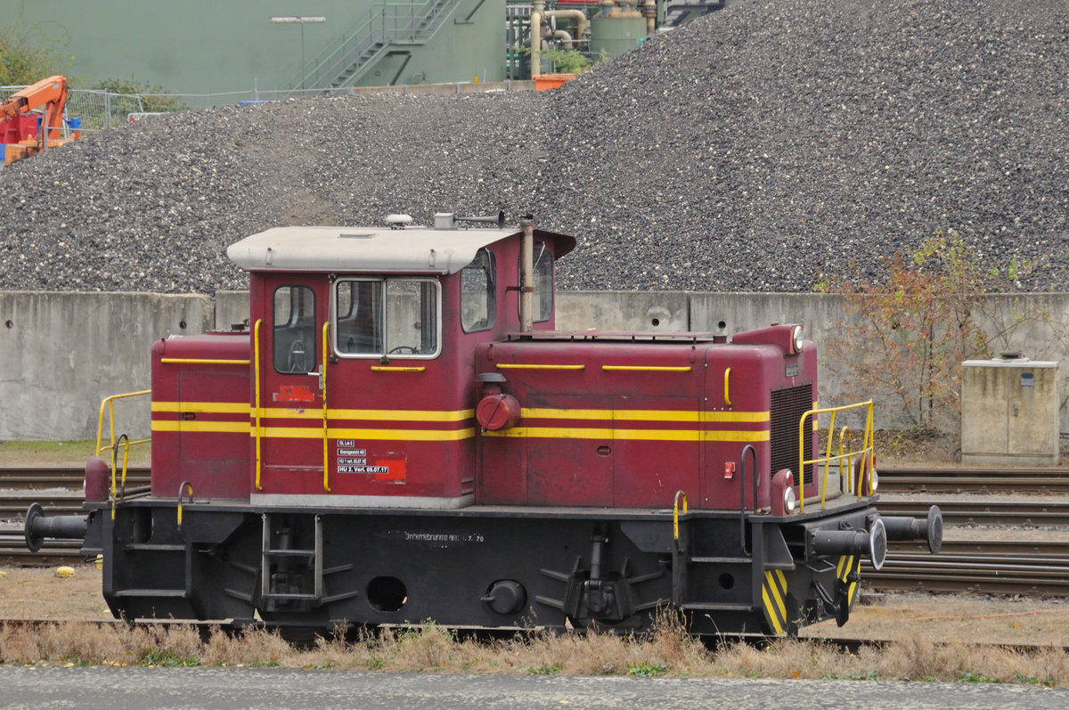 InfraServ Logistic Lok 3 (D 35 B ex, Gmeinder 5469, Bj. 1970), am 18.08.2012 im Anschluss von Clariant in Frankfurt (M) Griesheim. Aus dem Zug heraus fotografiert.
