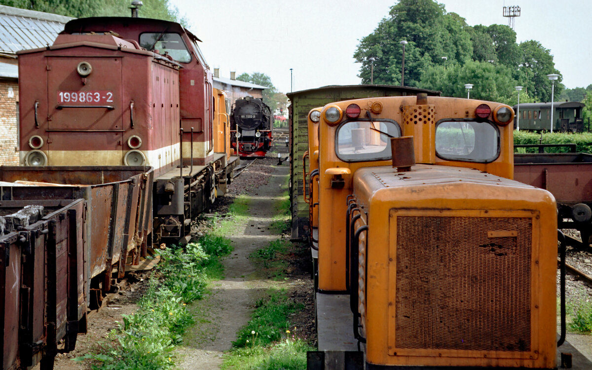 Vom Gleisende aus konnte am 23.06.1992 im Bw. Wernigerode-Westerntor die auf 1.000 mm umgespurte DR 199 863 und die Kleinlok 199 006 fotografiert werden.