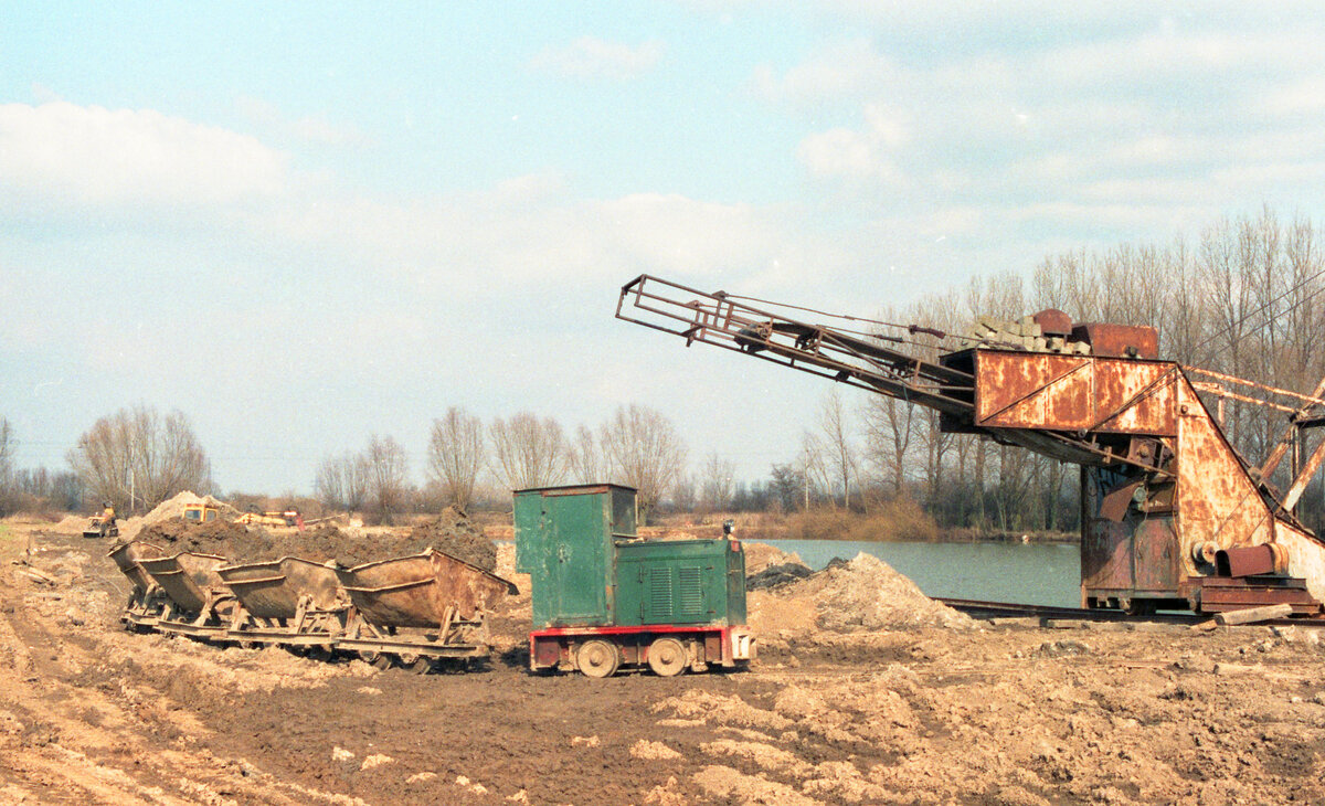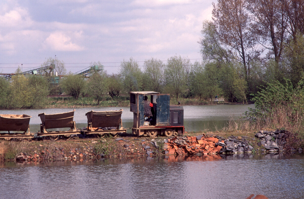 Die Diema Lok (Nr 2487) kommt mit Loren von der Lehmgrube und fährt über den Damm der zum Werk der Ziegelei Meyer führt. Emmerich-Vrasselt, 09.03.1993. Bild 10404. Rob Freriks