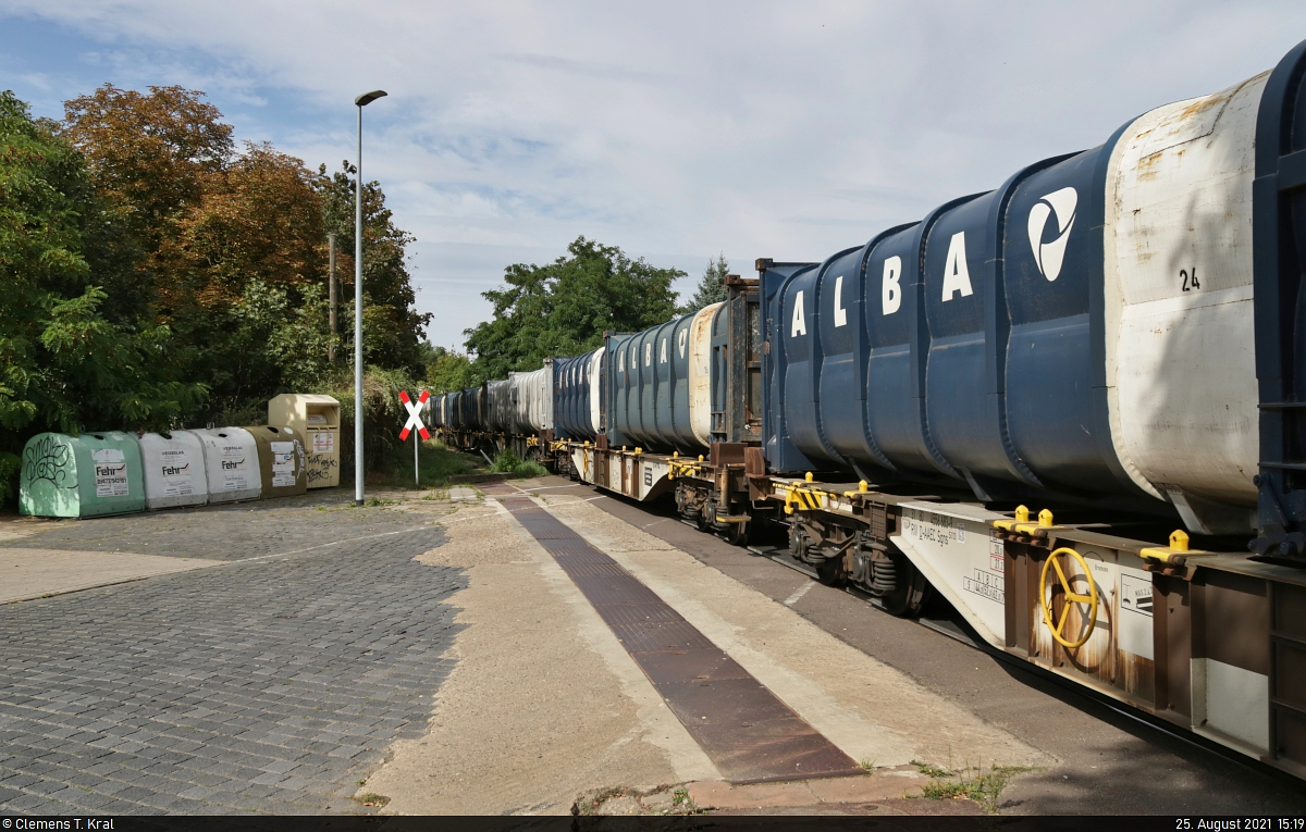 275 821-7 (Lok 1021 | Vossloh G 1206) drückt Müllcontainer zur Verbrennungsanlage in Staßfurt. Dabei nutzt der Zug das Anschlussgleis zum Ciech Sodawerk. Soeben ist er über die Atzendorfer Straße gefahren.