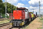 Regiobahn Bitterfeld Berlin GmbH, Bitterfeld [D] mit der Doppeltraktion MaK G 1206 Loks "1025" (NVR: "92 80 1275 027-1 D-RBB") + "1116" (NVR-Nummer: 92 82 000 1506-5 L-RBB) und einem Ganzzug französischer Schüttgutwagen mit Schwenkdach am 21.06.23 Durchfahrt Bahnhof Ruhland.