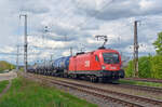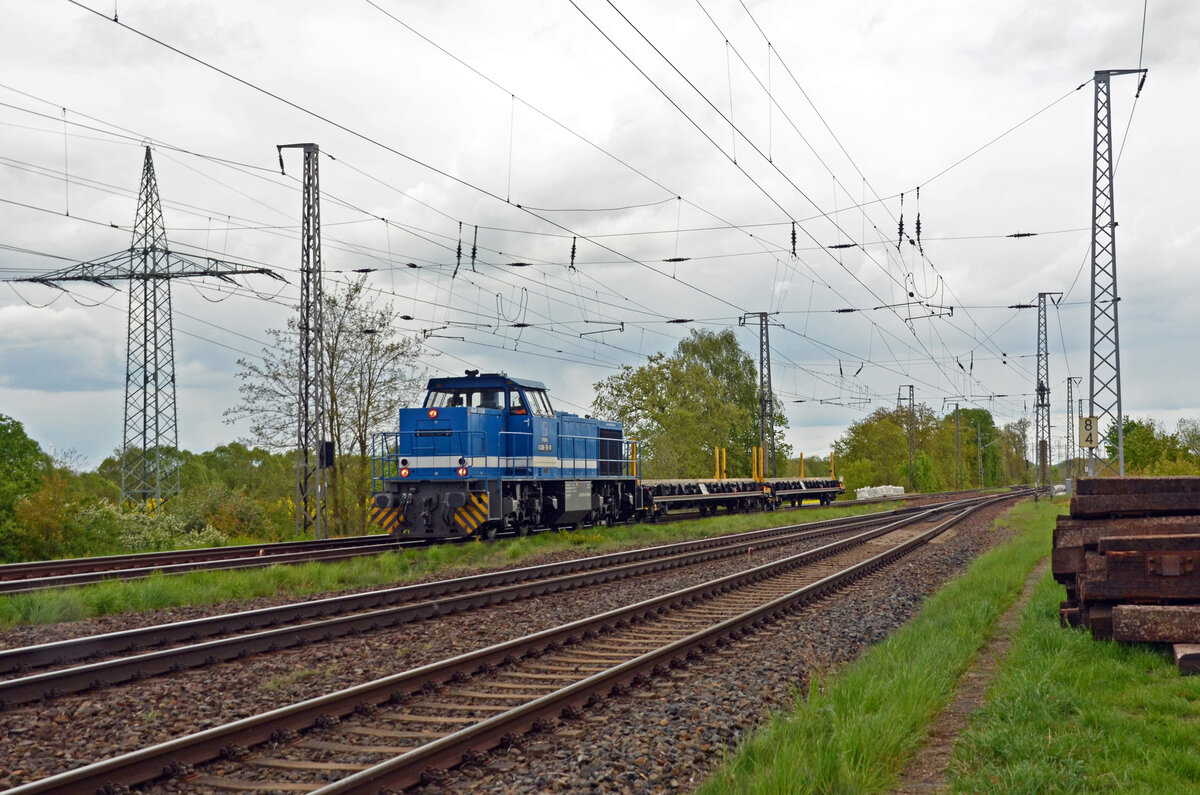 275 846 der Spitzke rollte am 18.04.24 mit zwei leeren Schwellentransportwagen durch Saarmund Richtung Potsdam.